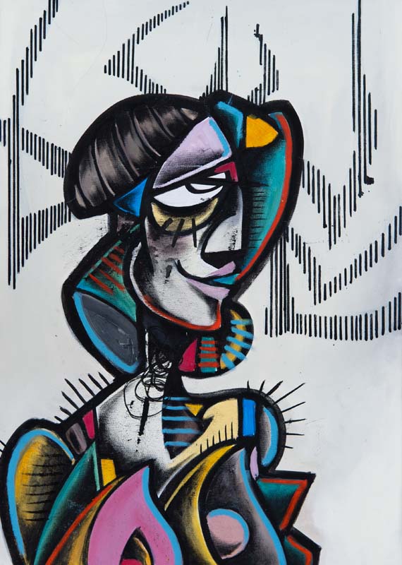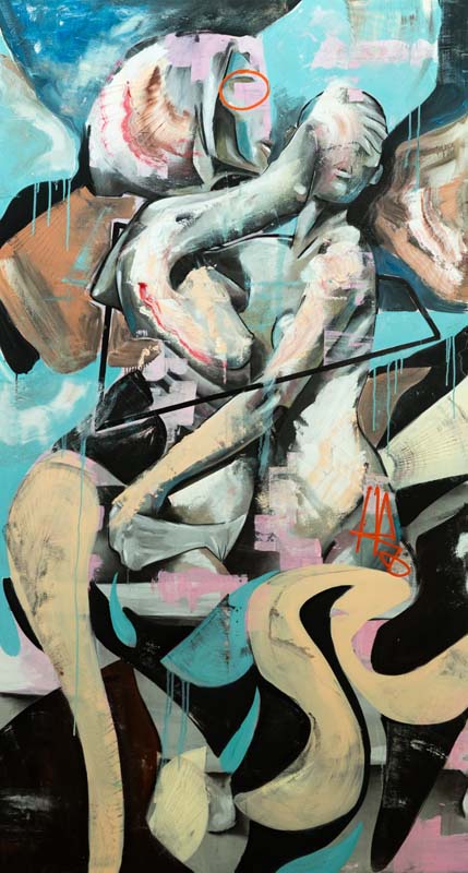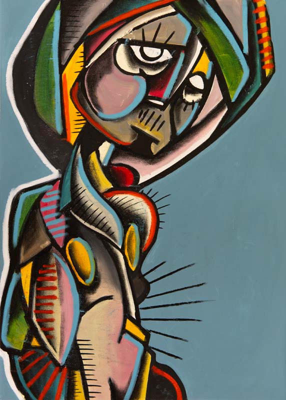 Harms' distinct style is characterized by vibrant colors, strong lines, abstract shapes and depicts characters in settings that transcend time and space.