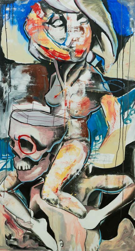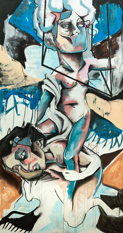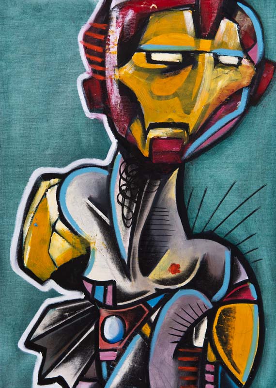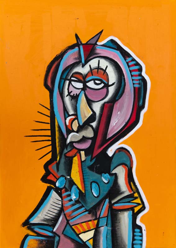 His distinctive visual language is marked by vibrant colors, bold lines, and abstracted forms. The figures inhabiting his paintings appear suspended in timeless, often surreal spaces, challenging conventional narratives and inviting open interpretation.